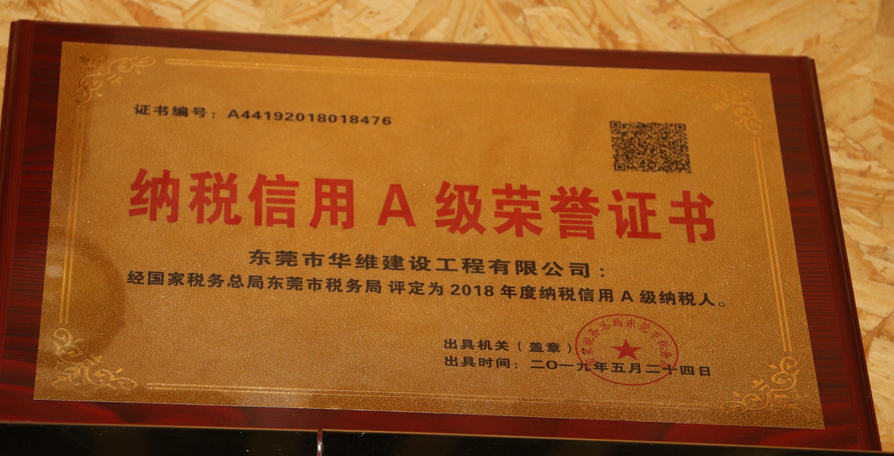 • 納稅信用A級榮譽證書